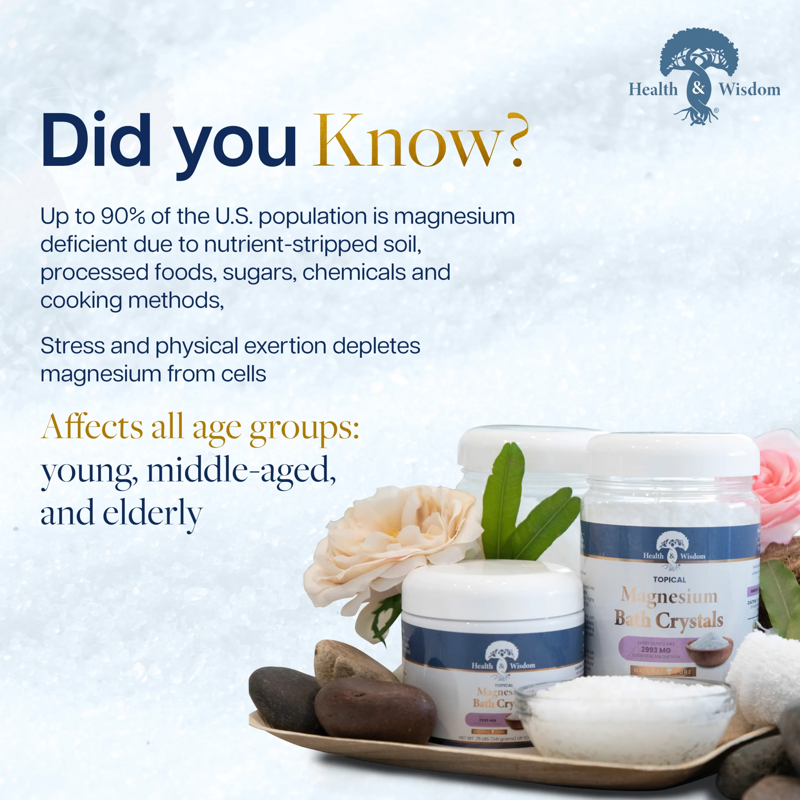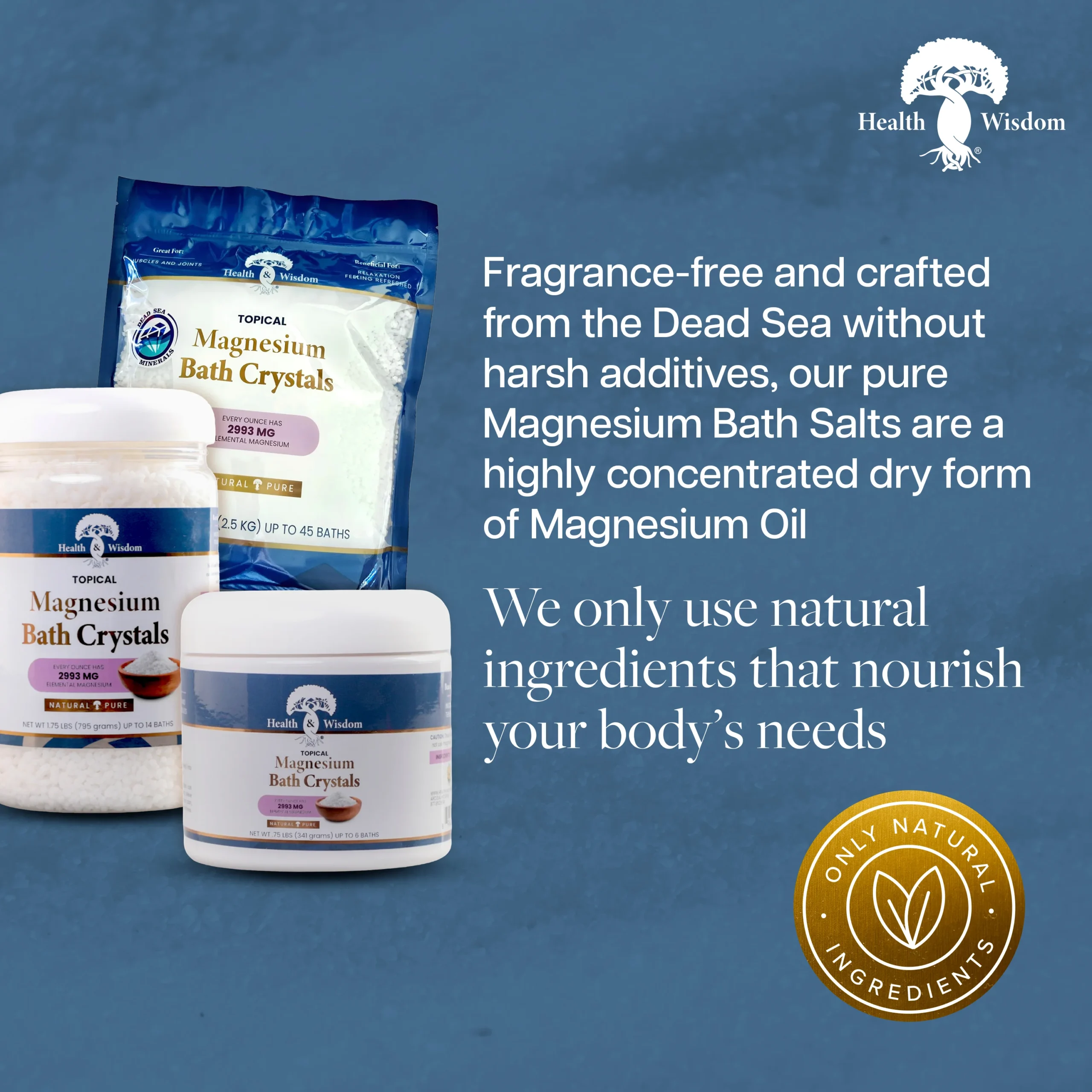 Health & Wisdom® makes it easy to buy magnesium bath salts online. Choose from the best magnesium flakes and crystal magnesium options to enhance your self-care routine. Our magnesium bath products are designed for comfort, safety, and effectiveness. With magnesium for sore muscles and relaxation, our range ensures every bath can be a nourishing experience.