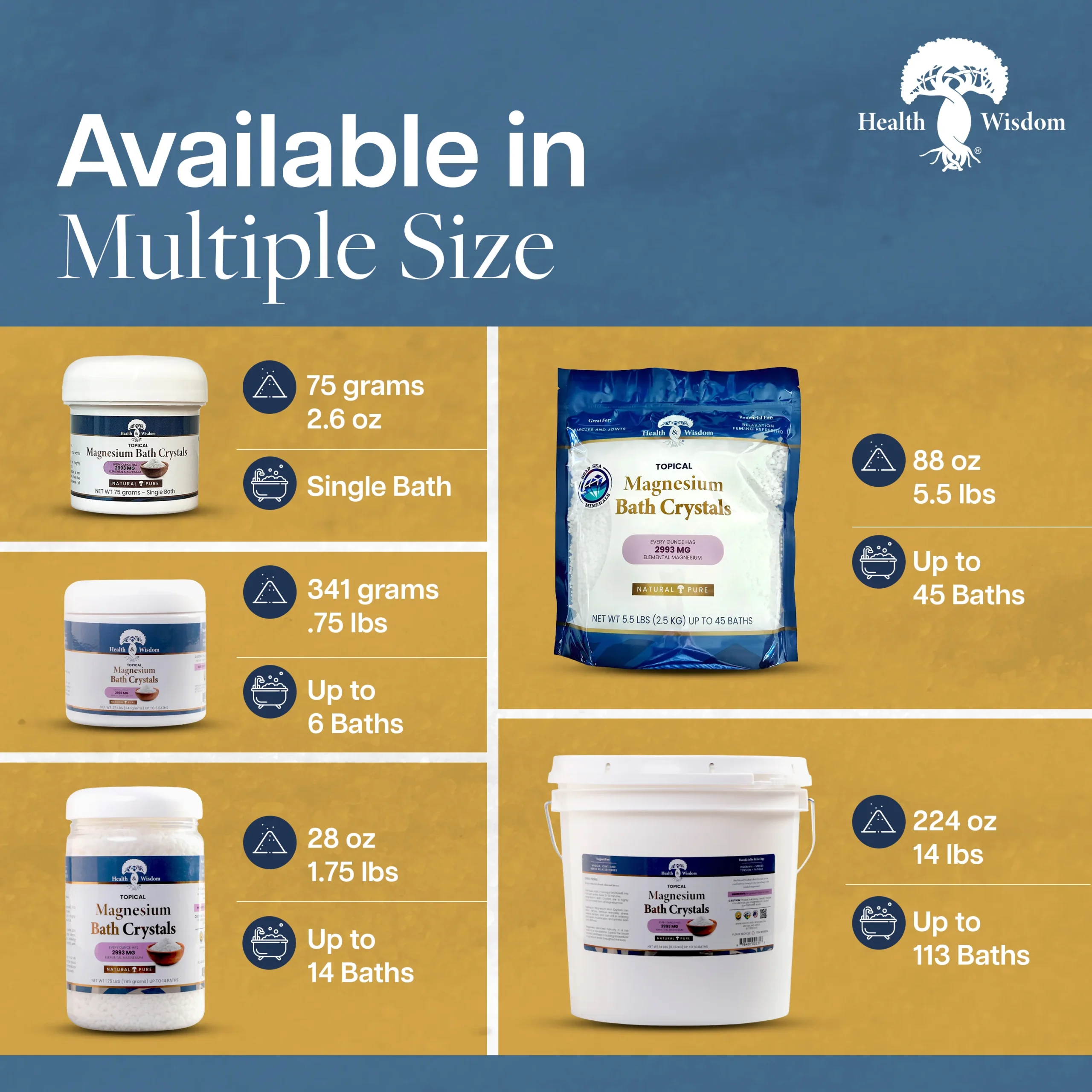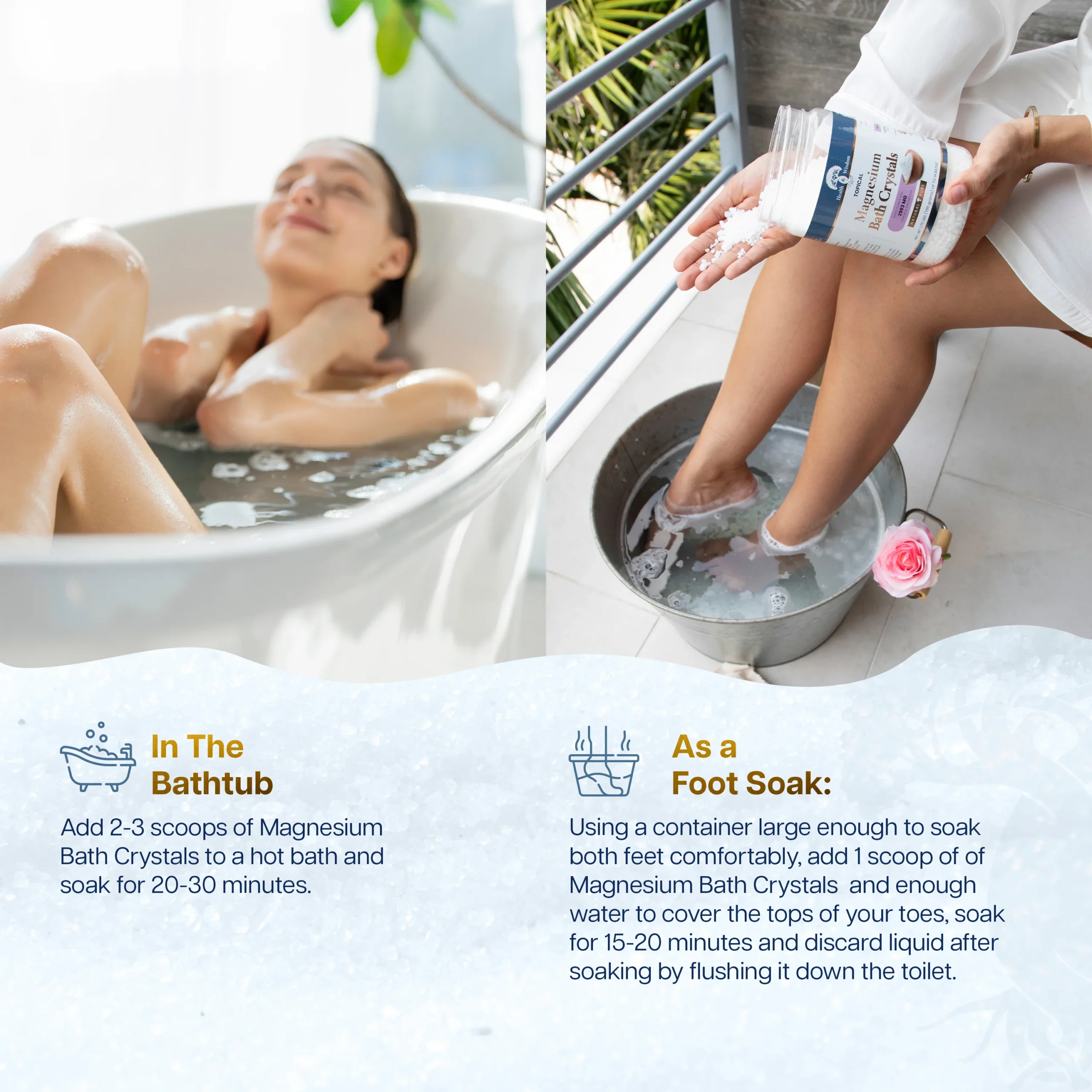 Redefine your bath into a soothing sanctuary with Health & Wisdom® magnesium bath crystals. Our crystal magnesium is carefully crafted to provide maximum relaxation and nourishment. Magnesium in bath water is known to support your body’s natural functions, making your magnesium baths a daily ritual of self-care. Whether you want to soothe sore muscles or simply enjoy a calming soak, our magnesium bath salts bring comfort and balance to your routine.