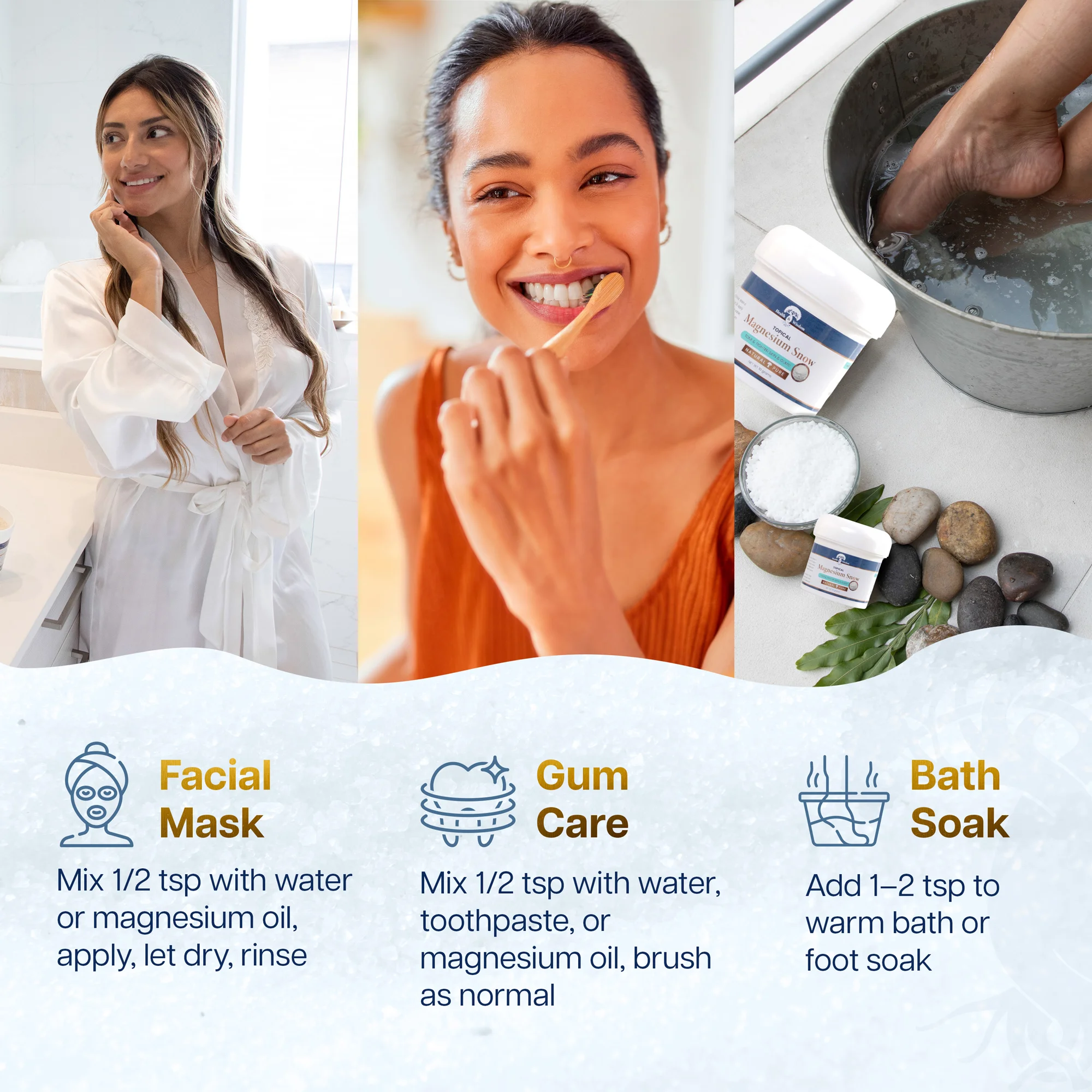 Bath: Add 1-2 Tbs. of Magnesium Snow to the bath to tighten and tone the skin.